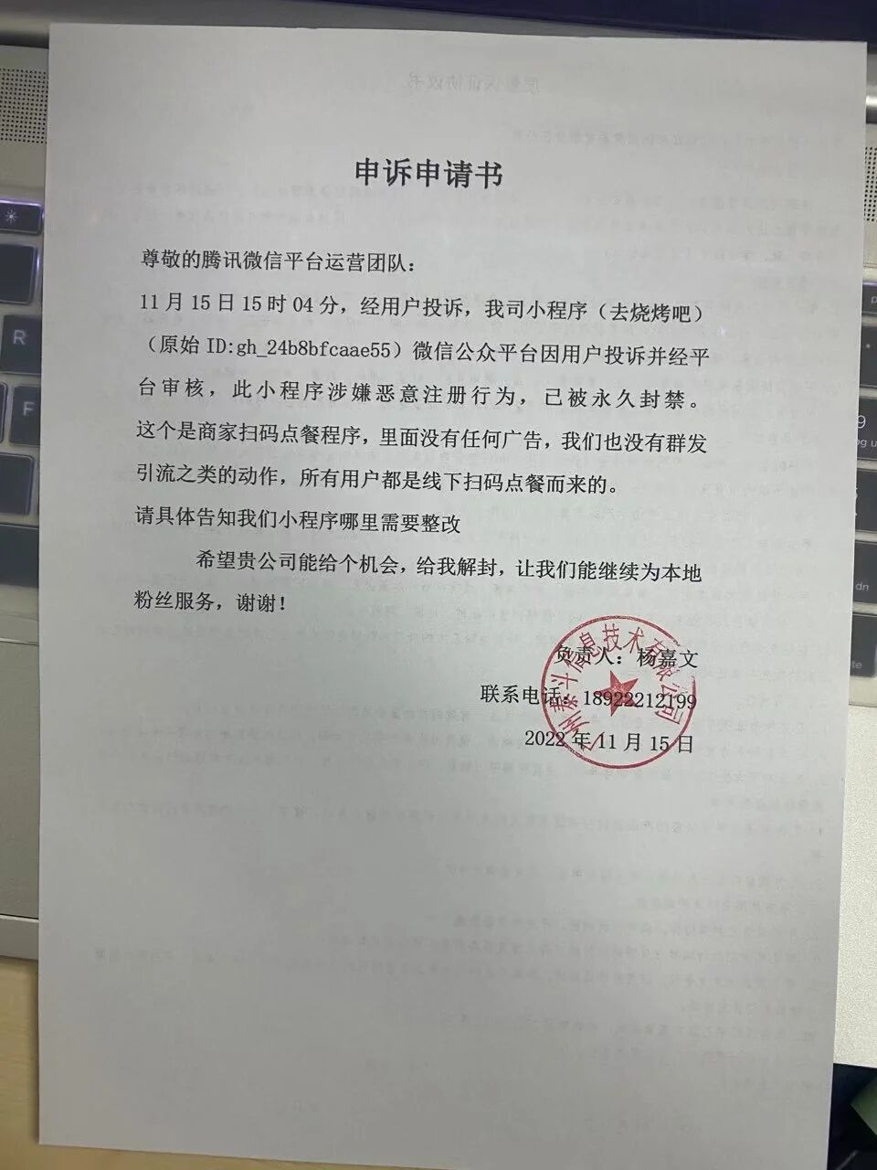 我的一个扫码点餐程序,也没有宣传之类的,平时只用来店里客人扫码点餐,怎么说我,(因用户投诉并经平台审核,此小程序涉嫌恶意注册行为,已被永久封禁。)我真的懵逼了!能给我一个解析吗!!!
