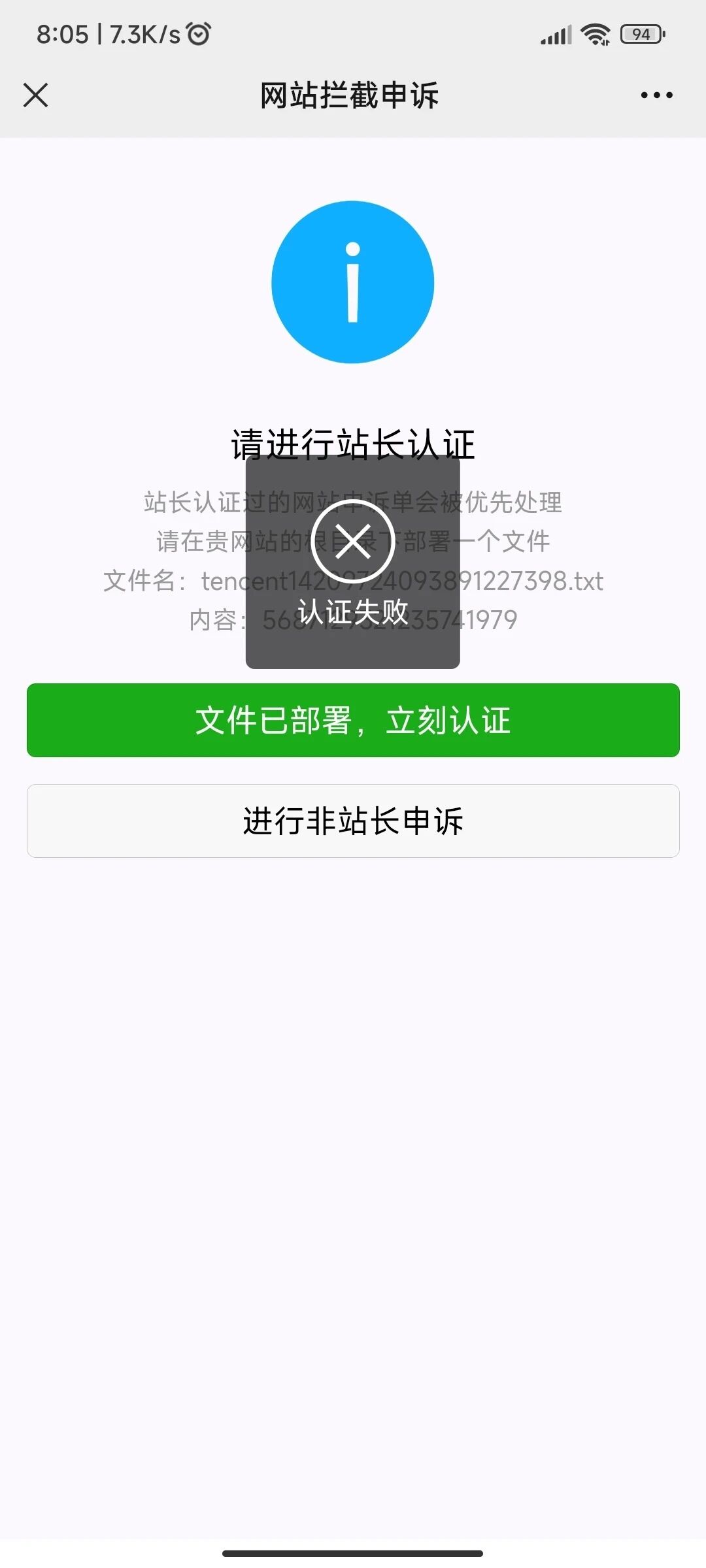 之前通过扫码填报的一个网址 突然被微信封掉了,通过站长认证部署文件找回,结果文件访问没有问题,但是认证一直失败,请查看是什么原因,并予以解封,感谢。