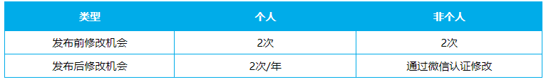 如图,个人发布后2次/年。非个人小程序发布后只能通过重新微信认证修改,300元费用