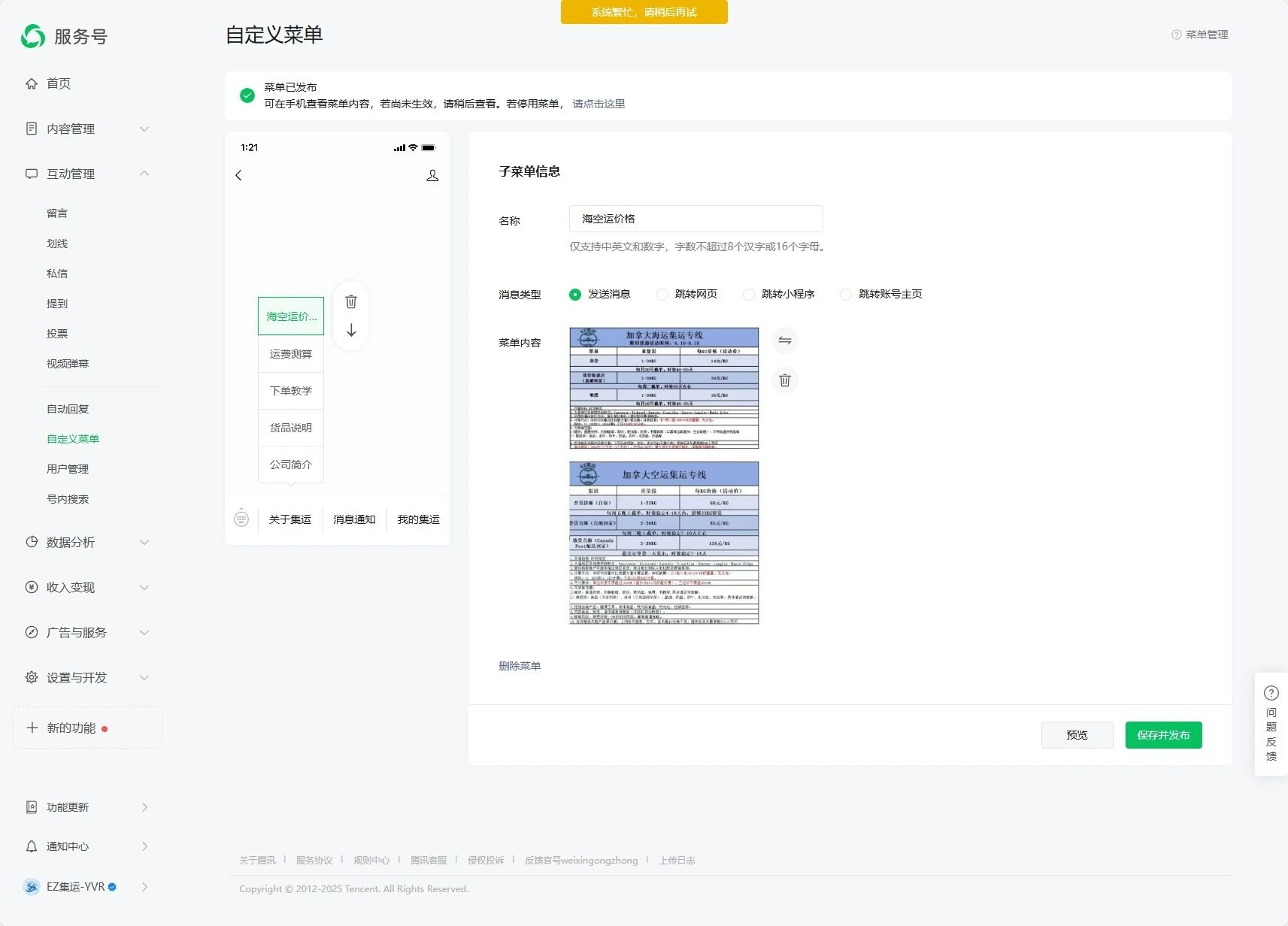 新认证的服务号,之前都能保存更改的,最近开始忽然不能修改任何自定义菜单栏了,一直提示系统繁忙完成不能修改,更换了不同的浏览器去操作也是如此。也没绑定过什么工具。