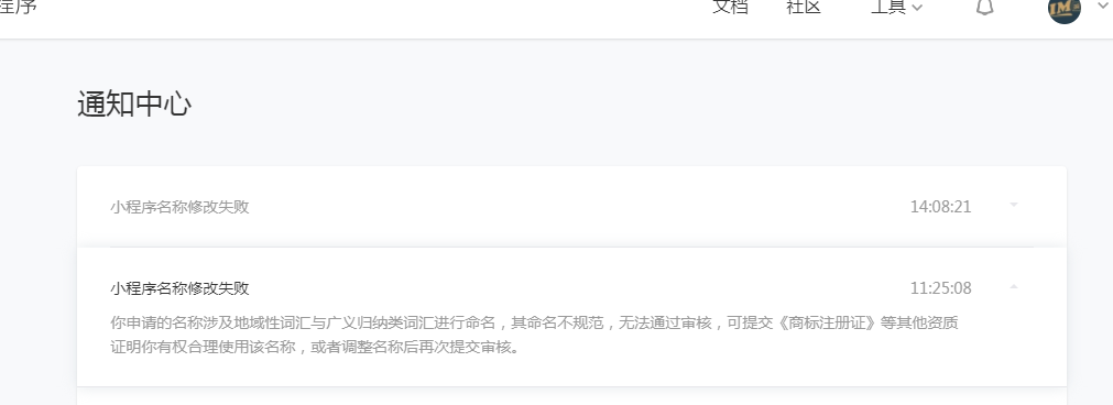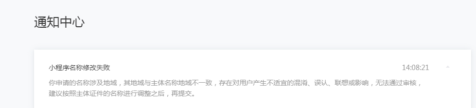 注册的时候名称是:无锡水果茶,当时可以注册,所有的都弄好了,打包上传了,说名称审核失败,让我提交相关资料。证书等,再次审核,依旧失败。 于是就按照要求换名称。 名称就换成无锡IM水果茶,自己的奶茶品牌,修改名称再次失败,告知要提供相关的品牌授权,或者商标。 OK没有问题,这些材料都有,问题你倒是给我一个提交的入口啊。 没有提交证书的入口,只能再次提交,审核了 3 4次都是同样的问题, 你不给提交的入口,让我如何提交商标等信息?????????大写问号脸。。。。 今天没办法只能换成 IM茶 无锡红豆万花城店, 再次审核又失败了,说小程序名称和我营业执照地域不符合!!!!!!!这个真的爆炸了,我的地址明明就是无锡梁溪区红豆万花城。 求官方人员出来给个答复,到底是人工审核 还是机器审核的????????