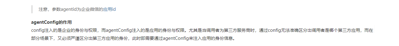 你好,config注入的是企业的身份与权限,而agentConfig注入的是应用的身份与权限。尤其是当调用者为第三方服务商时,通过config无法准确区分出调用者是哪个第三方应用,而在部分场景下,又必须严谨区分出第三方应用的身份,此时即需要通过agentConfig来注入应用的身份信息