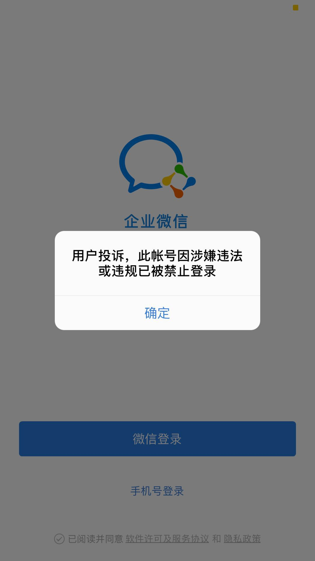 6月30号18点左右电脑版企业微信莫名其妙被弹出来,提示手机企业微信没有登录。第二天重新登录手机版企业微信的时候就显示“用户投诉,此账号涉嫌违法或违规被禁止登录”。