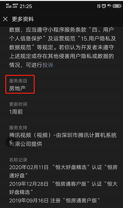 小程序服务类目都是房地产并没有添加房地产销售,为什么《恒房通好盘》小程序可以上支付功能。