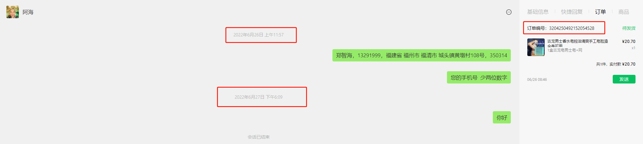 因为买家手机号码没有写全,导致无法发货,26号和27号都 有通过客服系统 联系买家,但买家一直未回复,期间也尝试咨询平台,平台给回复是只能等买家 联系我,