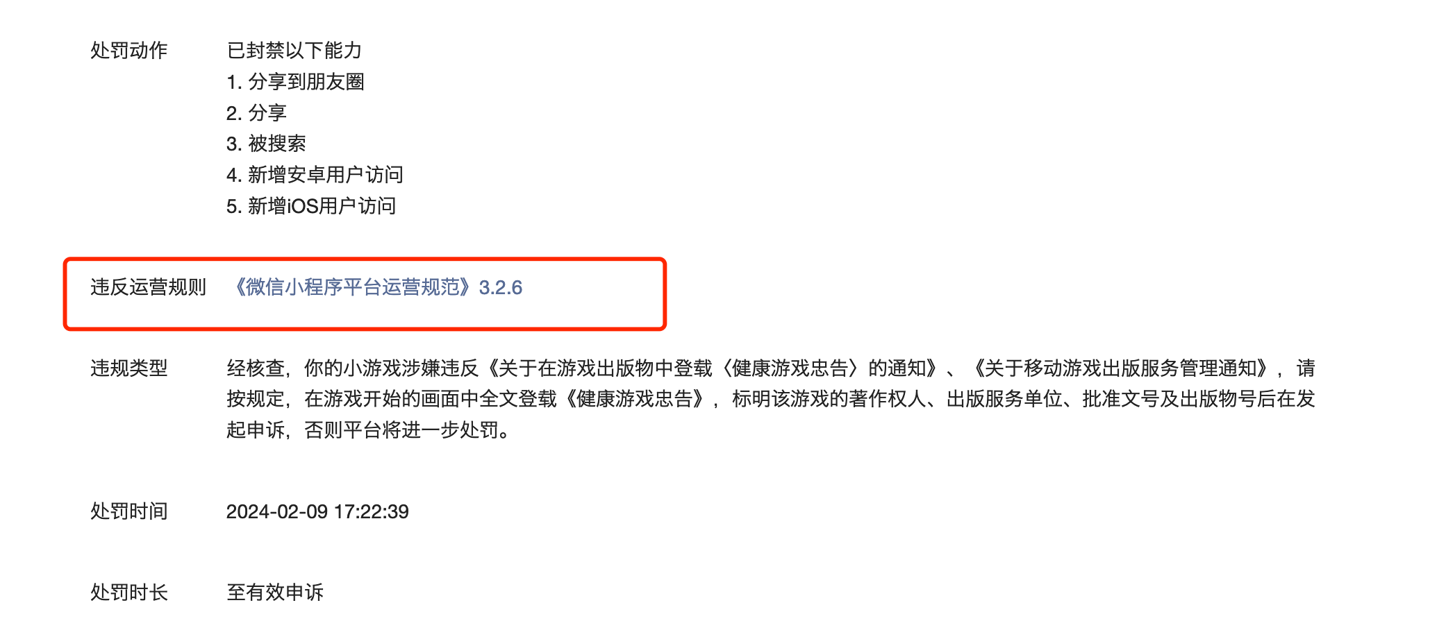 问题:经核查,你的小游戏涉嫌违反《关于在游戏出版物中登载〈健康游戏忠告〉的通知》、《关于移动游戏出版服务管理通知》,请按规定,在游戏开始的画面中全文登载《健康游戏忠告》,标明该游戏的著作权人、出版服务单位、批准文号及出版物号后在发起申诉,否则平台将进一步处罚。