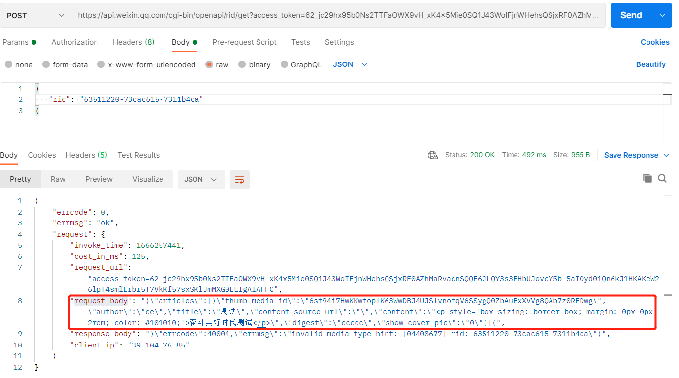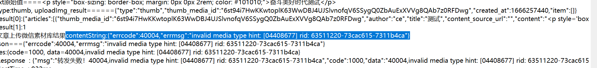 首先使用新增临时素材接口进行新增(http请求方式:POST/FORM,使用https https://api.weixin.qq.com/cgi-bin/media/upload?access_token=ACCESS_TOKEN&type=TYPE 调用示例(使用 curl 命令,用 FORM 表单方式上传一个多媒体文件): curl -F media=@test.jpg "https://api.weixin.qq.com/cgi-bin/media/upload?access_token=ACCESS_TOKEN&type=TYPE"),新增成功返回有media_id,将这个media_id用在上传图文消息素材【订阅号与服务号认证后均可用】接口(http请求方式: POST https://api.weixin.qq.com/cgi-bin/media/uploadnews?access_token=ACCESS_TOKEN)中作为入参thumb_media_id使用,返回报错40004。contentString:{"errcode":40004,"errmsg":"invalid media type hint: [04408677] rid: 63511220-73cac615-7311b4ca"}