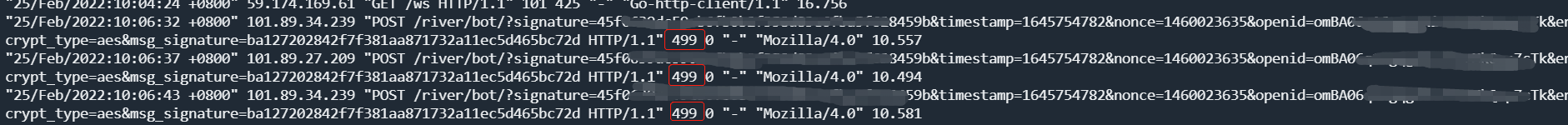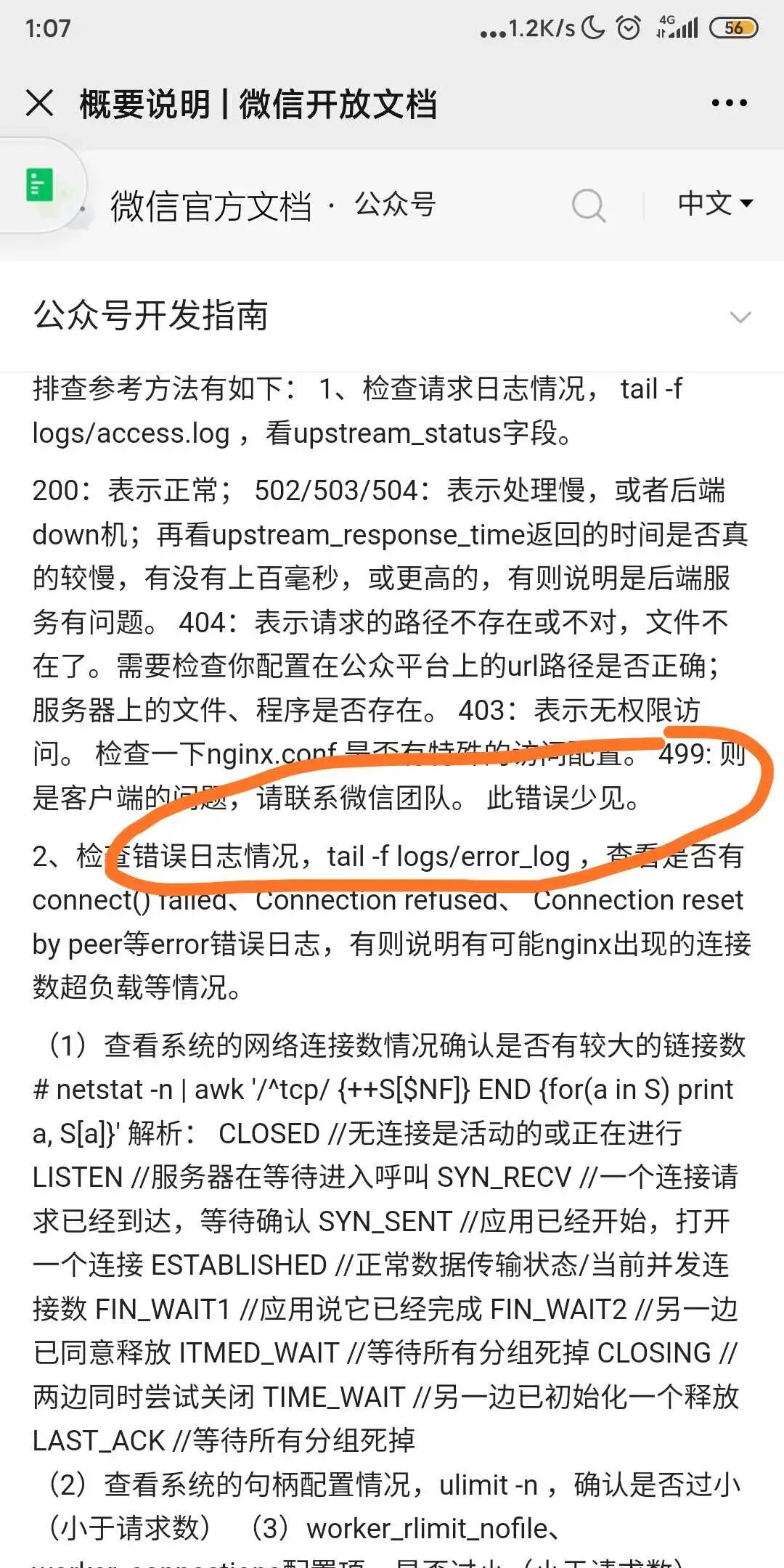 微信公众号报警排查指引上nginx相关指引有说499是客户端问题,请联系微信团队。