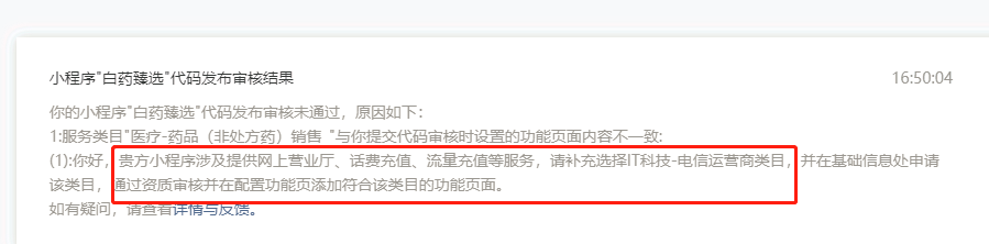 云南白药的官方商城小程序,已经发布上线了的,近期进行代码更新,审核被驳回,理由是存在话费流量充值,需要增加电信运营类目,但客户商城上只有药品和日化,没有话费流量充值入口,请核实情况并尽快帮忙处理小程序【白药臻选】代码审核问题,谢谢。