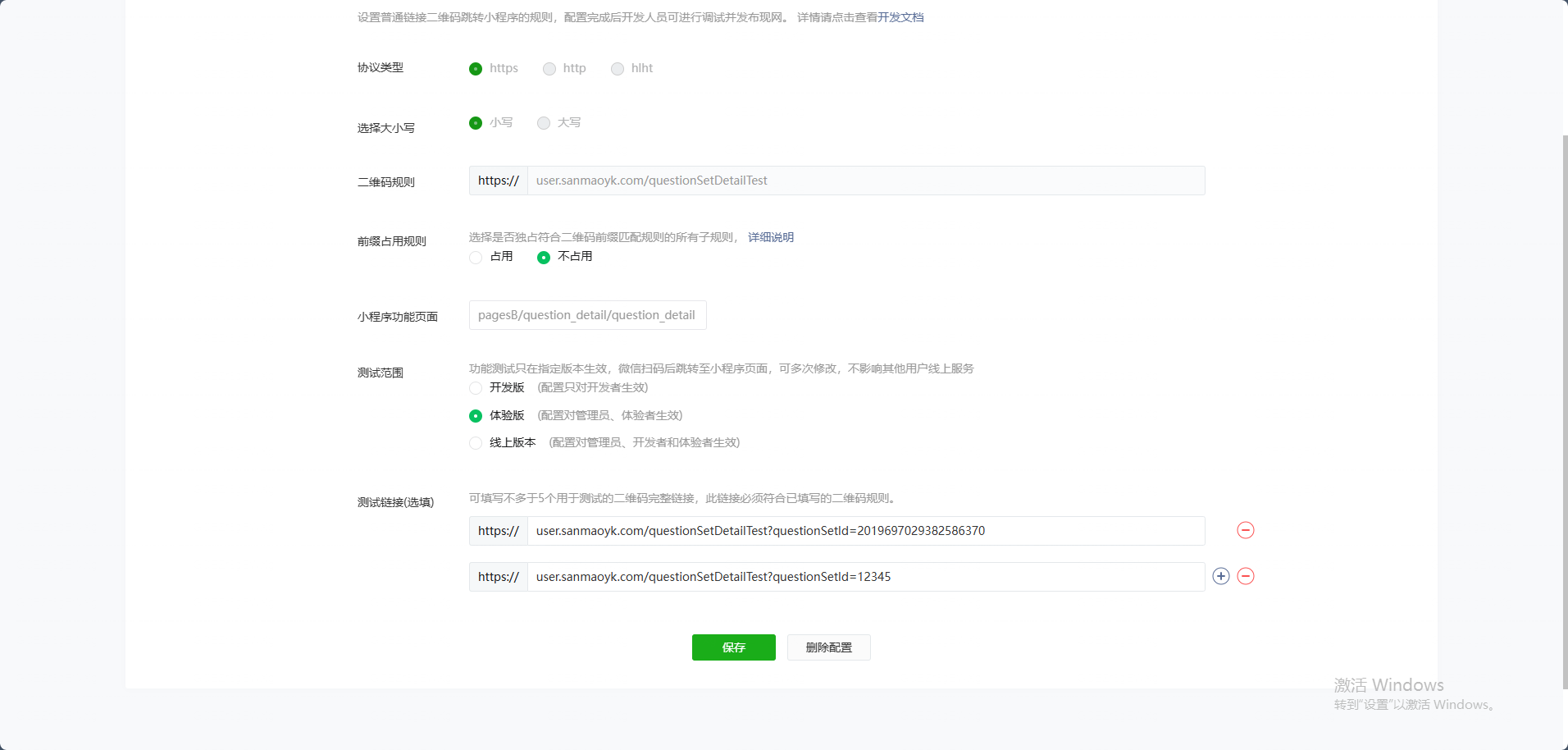 测试链接设置了,二维码规则也发布了,选的体验版。在开发者工具使用这个链接生成的二维码快速编译,页面没有数据