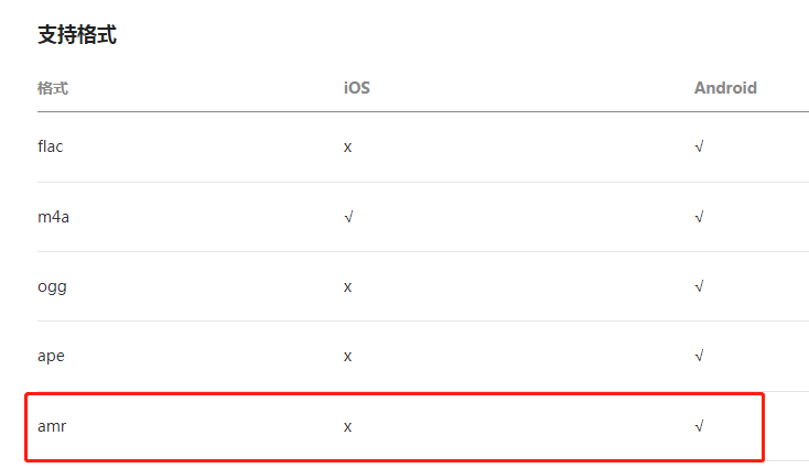 后端传过来的音频格式为amr,明明文档中写着安卓支持播放amr格式的音频,但是实测并不行。