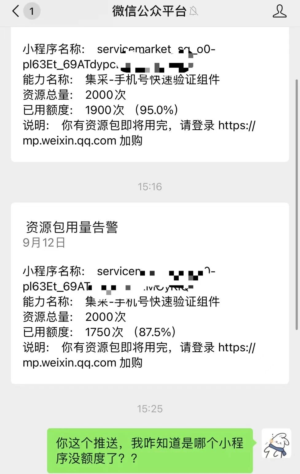 提醒我额度不足了,但是看不到是哪个小程序,也点不进去,完全不知道是哪个小程序额度爆了~~~把我急得呀