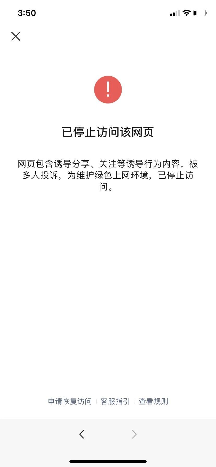 你好,经审核,域名5008shop.top下的链接:【http://jey6lsifxe.shop.5008shop.top/hd_mntSvd3BeJ?i=3&c=entry&rid=196933&fid=7448509&aid=7448509&do=index&m=ldy_infgroupbuy&sharetime=1656409598&redirecturl=rhost、http://y6rdej6ccp.shop.5008shop.top/hd_QjbPmaftB8?i=3&c=entry&rid=195792&fid=7249881&aid=7249881&do=index&m=ldy_infgroupbuy&sharetime=1655720309&redirecturl=rhost、http://qpv7lpiiwq.shop.5008shop.top/hd_EKpPozWo03?i=3&c=entry&rid=193412&do=index&m=ldy_infgroupbuy&re=1&redirecturl=rhost】的内容严重违反《微信外部链接内容管理规范》的第1和11条“诱导分享、获取用户信息类内容”,且存在反复违规情况,暂不予恢复微信内直接访问的服务,请知悉。
