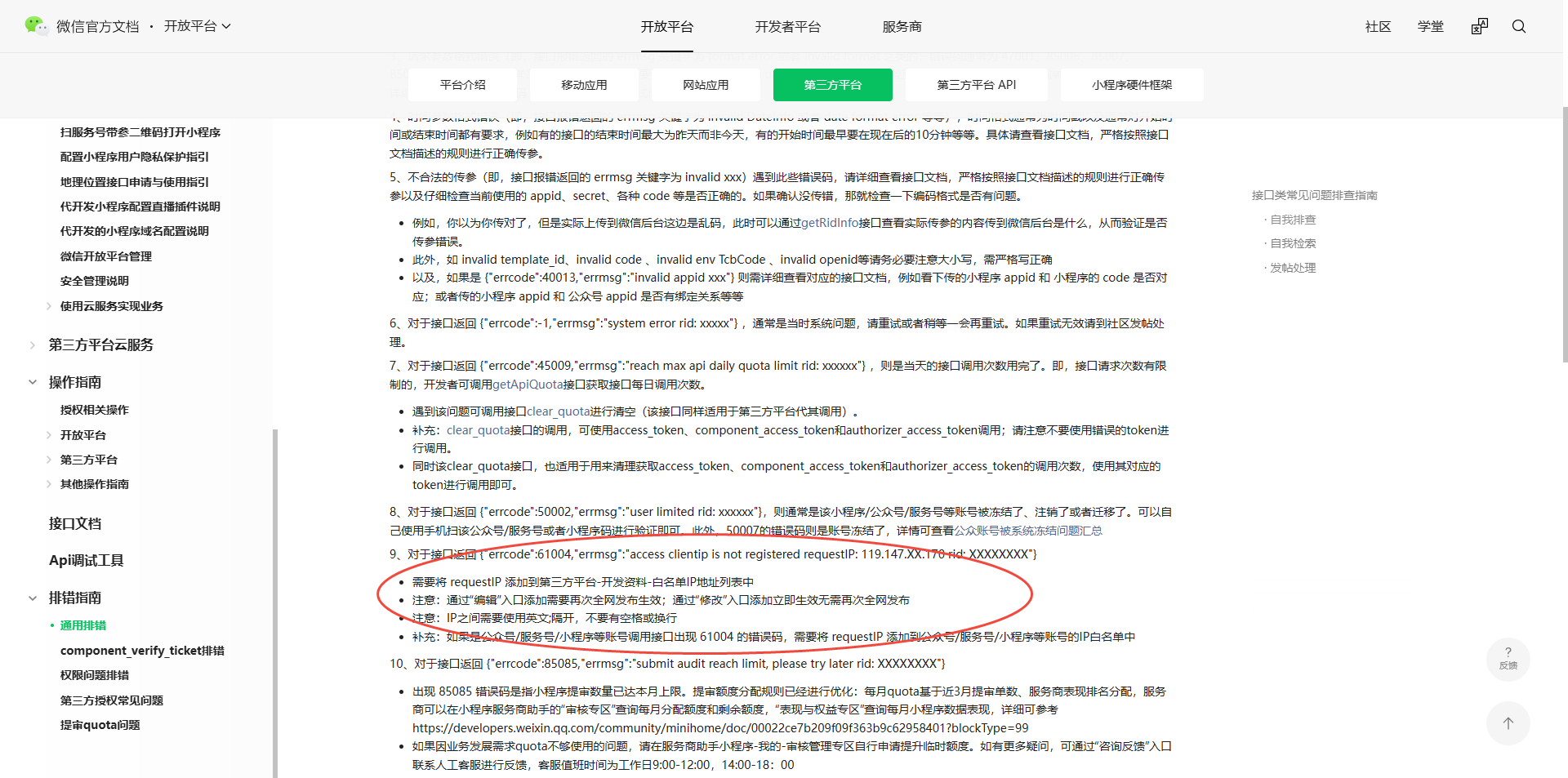 2、第三方平台接口报错61004,需要去第三方平台-开发资料中添加IP白名单 https://developers.weixin.qq.com/doc/oplatform/Third-party_Platforms/2.0/troubleshooting/TroubleShooting.html