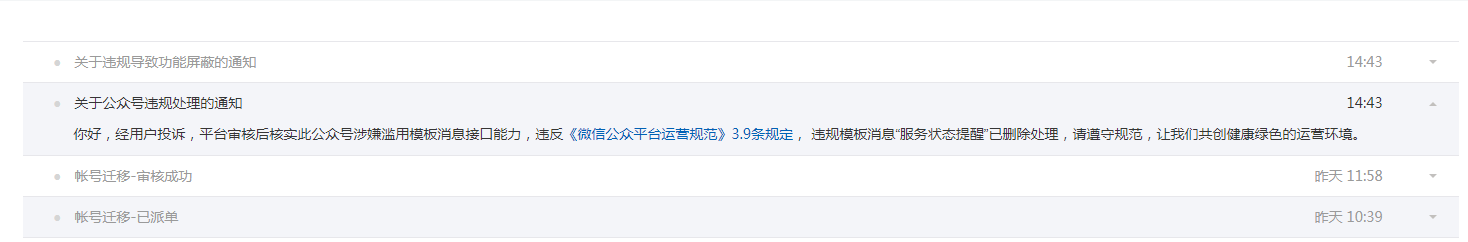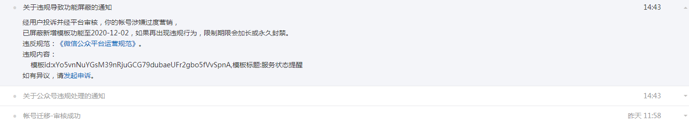 目前迁移的准备工作已经完成,审核也通过了,但原账号随后又收到模板消息被“已限制添加新模版至2020-12-02”的消息。