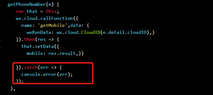 getPhoneNumber(e) { if (e.detail.errMsg === 'getPhoneNumber:ok') { wx.showLoading({ title: '加载中' }) wx.cloud.callFunction({ name: 'getPhoneNumber', data: { phoneNumber: wx.cloud.CloudID(e.detail.cloudID) }, }).then(resData => { wx.hideLoading() this.setData({ phoneNumber: resData.result.phoneData.phoneNumber }) }) } }