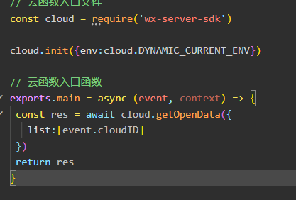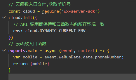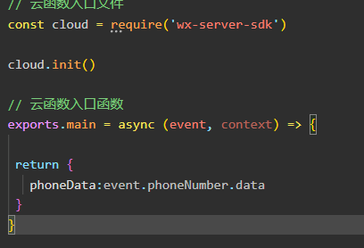 getPhoneNumber(e) { if (e.detail.errMsg === 'getPhoneNumber:ok') { wx.showLoading({ title: '加载中' }) wx.cloud.callFunction({ name: 'getPhoneNumber', data: { phoneNumber: wx.cloud.CloudID(e.detail.cloudID) }, }).then(resData => { wx.hideLoading() this.setData({ phoneNumber: resData.result.phoneData.phoneNumber }) }) } }// 云函数入口文件const cloud = require('wx-server-sdk')cloud.init()// 云函数入口函数exports.main = async (event) => {return {phoneData: event.phoneNumber.data}}