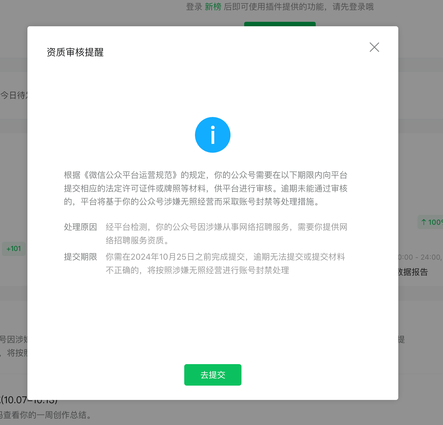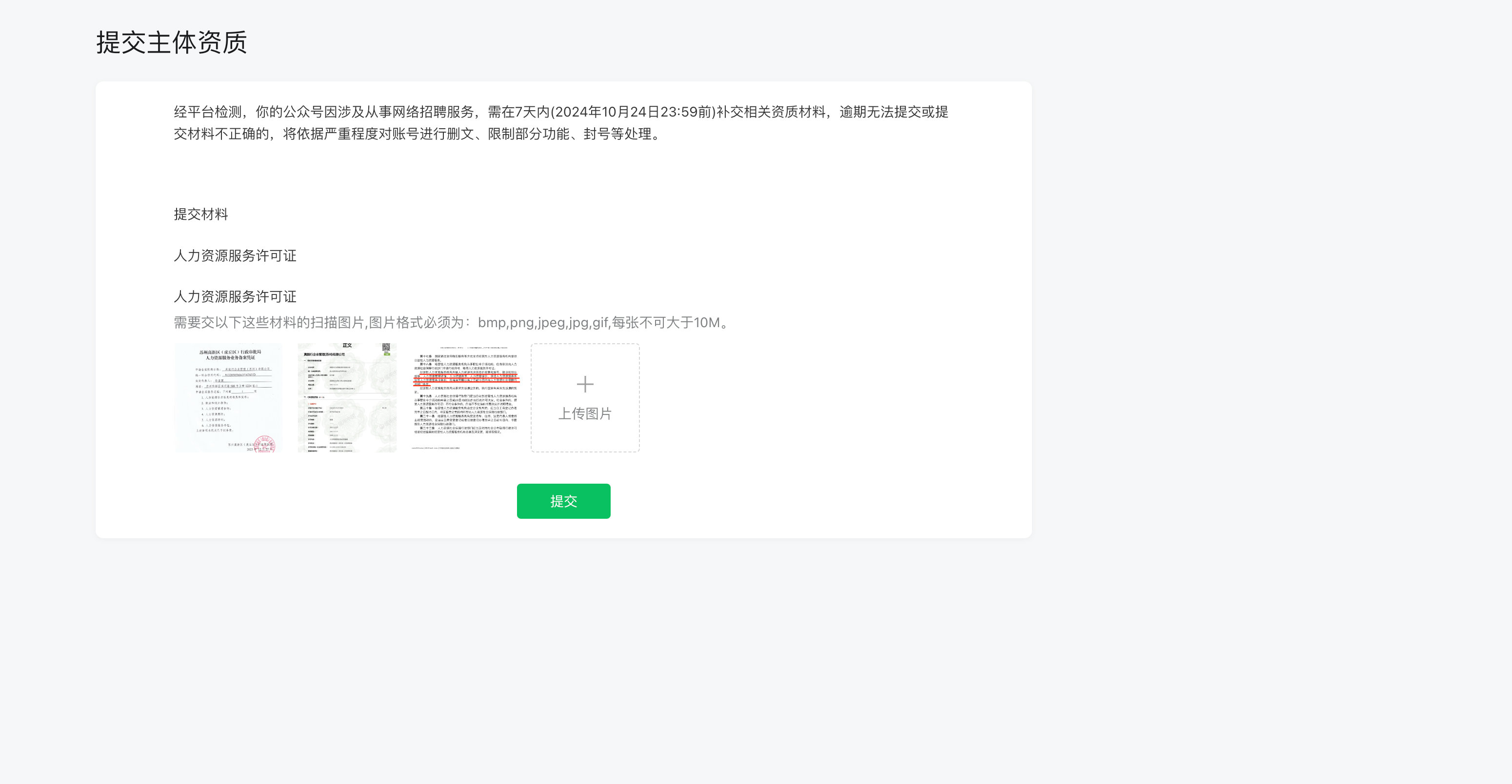 10月18号突然提示涉嫌招聘业务,本公司运营公众号涉及未招聘中介服务,只涉及发布收集信息,因为只涉及发布信息同时和政府部门问过这个问题 同时办理了人力资源备案的相关资质,已经提交了相关法定资料审核资料今天周一10月21号 看到驳回了提交资料?