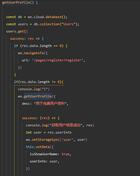 然后预期的效果是,如果用户没有注册过就会去注册页面,如果注册过就直接调用getUserProfile获取用户信息,