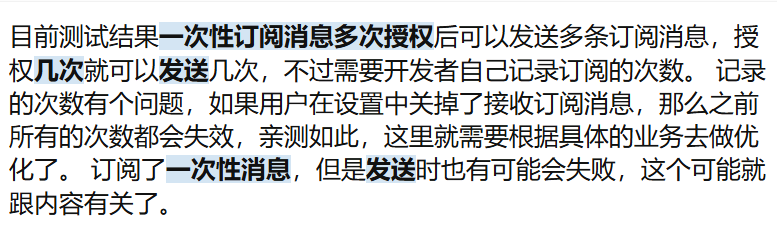 正常情况下是授权订阅一次可以推送一次,没有时间限制只有次数限制,需要自己记录用户订阅次数后台推送的时候减去相应次数。用户设置里关闭订阅会清空订阅次数也是需要自行处理。