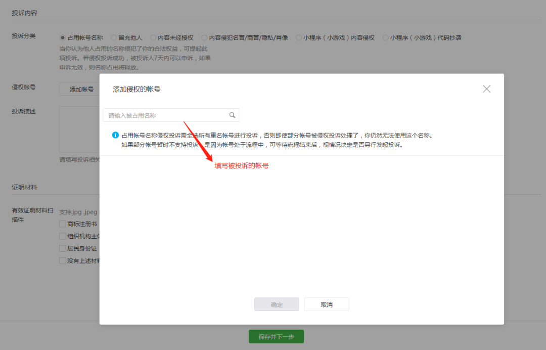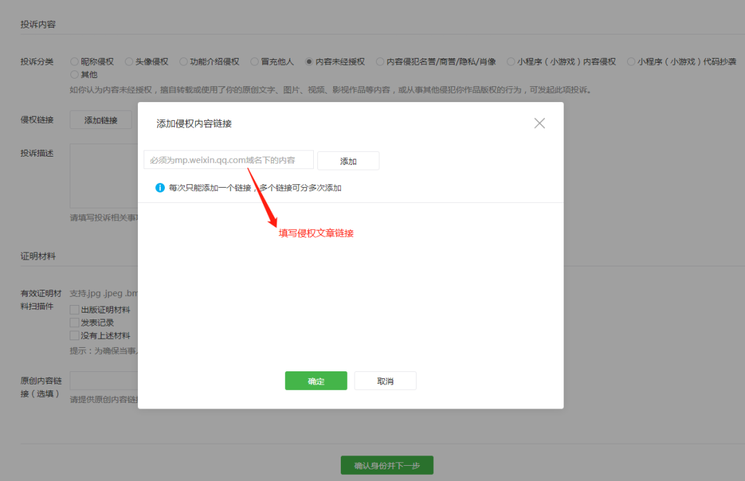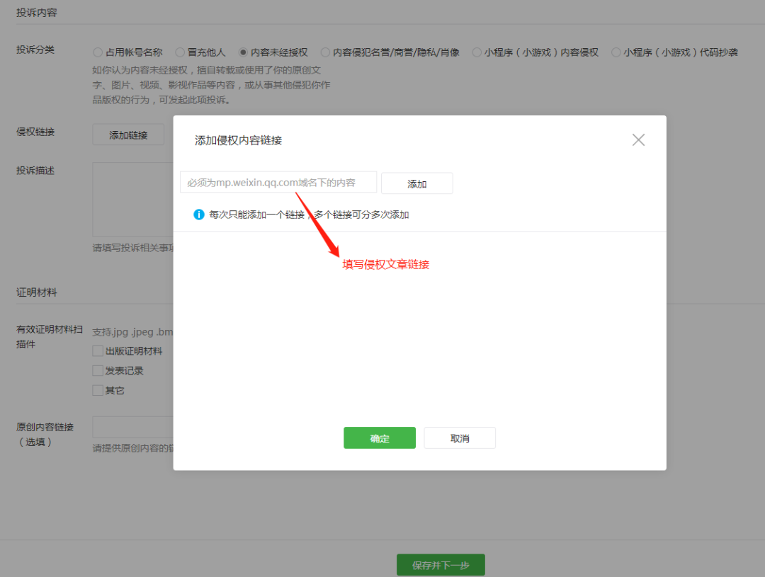2、添加侵权的公众号或者添加侵权文章链接,并提交相关投诉的材料,即可完成投诉 ;