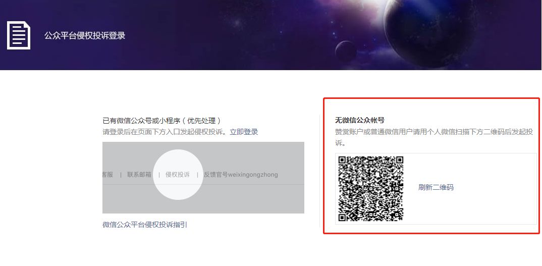 二、若无微信公众号,请复制链接(https://mp.weixin.qq.com/acct/infringementlogin?action=getkey&lang=zh_CN)在浏览器中打开网站,选择“无微信公众帐号”进行投诉: