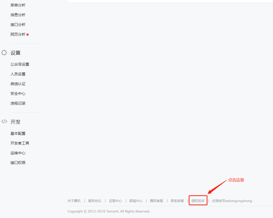 1、【登录公众平台】->【点击底部“侵权投诉”】->【我要投诉】;