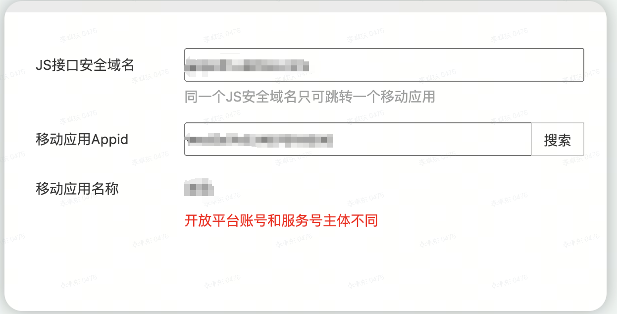 背景:目前想通过“微信开放标签”跳转应用,但是服务号和开放平台绑定JS接口安全域名的时候,提示主体不一致。