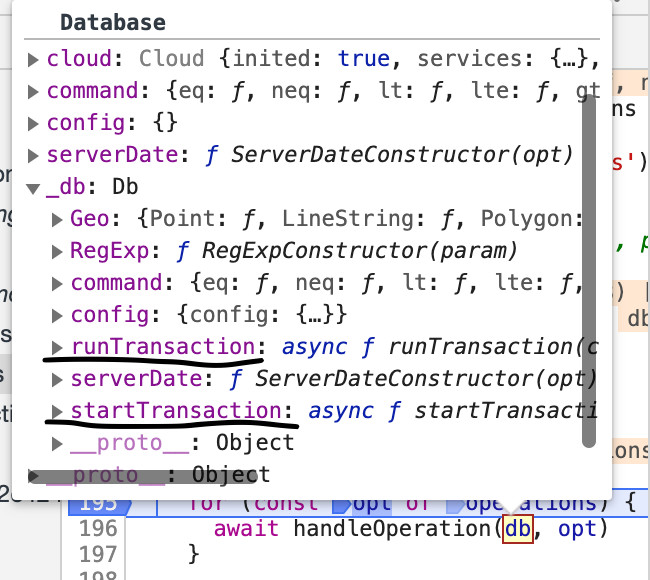 今天调试云函数时发现db有个类似私有变量的属性是_db,里面有2个异步方法 :runTransaction 和 startTransaction。