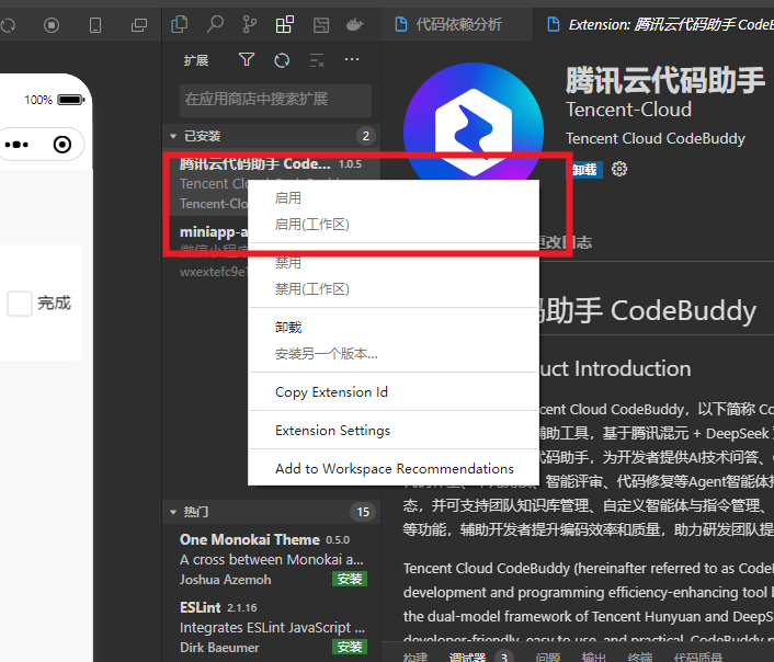 下载最新版 微信开发者工具 ,在「设置-扩展设置-编辑器扩展」中,安装「腾讯云代码助手 CodeBuddy」插件。