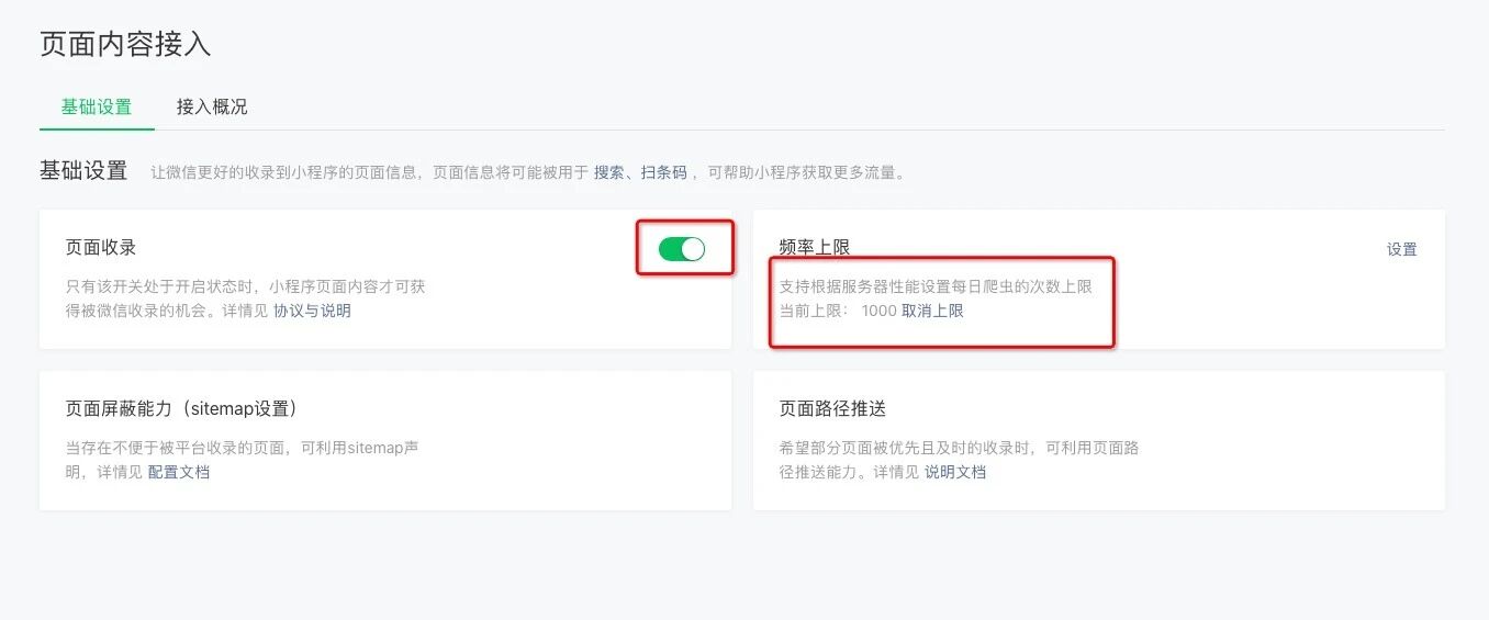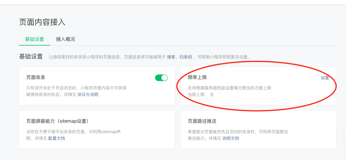 2. 在微信管理后台,功能 -> 页面内容接入中可以设置爬虫频率上限