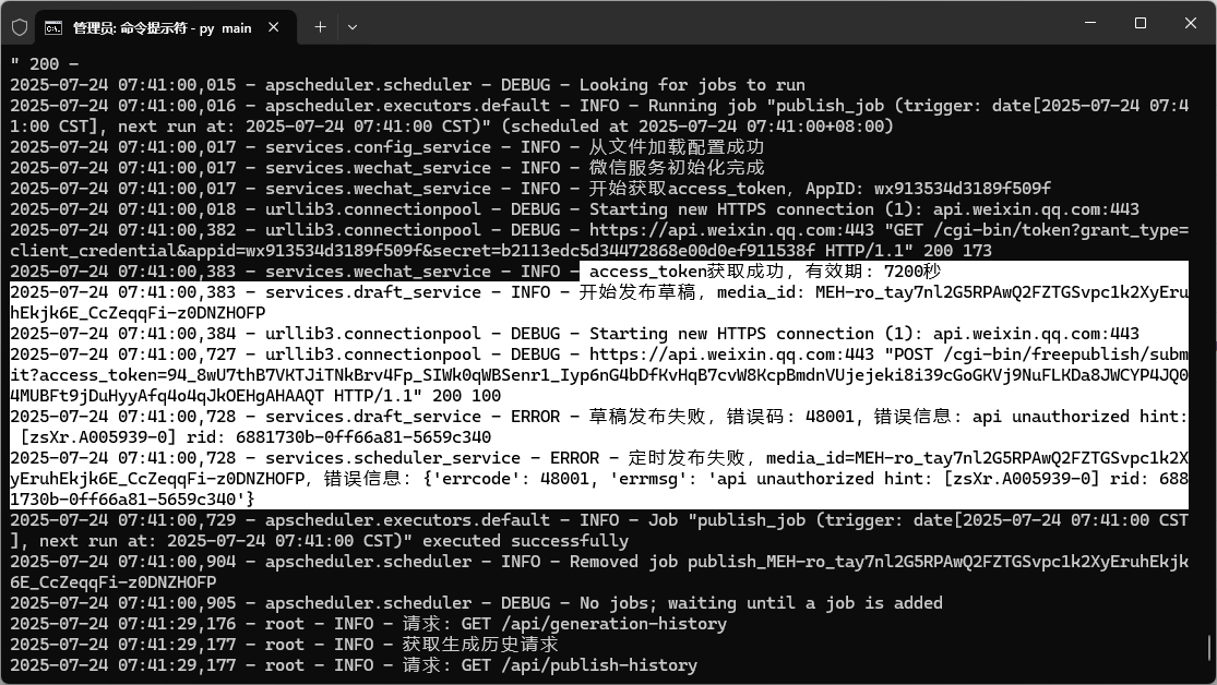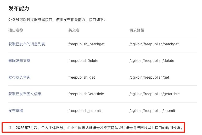 自2025年7月起,个人主体账号、企业主体未认证账号及不支持认证的账号将被回收发布能力相关接口的调用权限。
