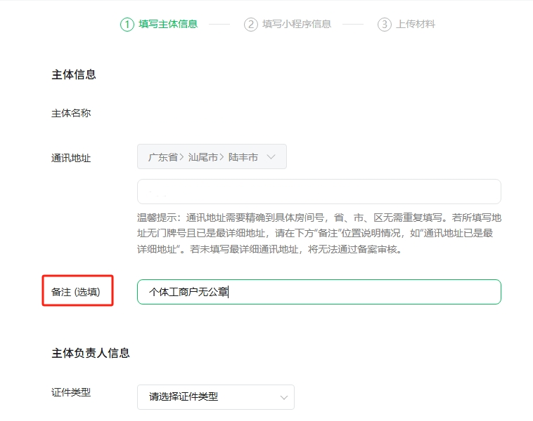 在微信小程序备案结尾要求备注“个体工商户无公章”,它不是写在承诺书里,而是在主体资料 - 地址信息下方的备注框,如图所示。