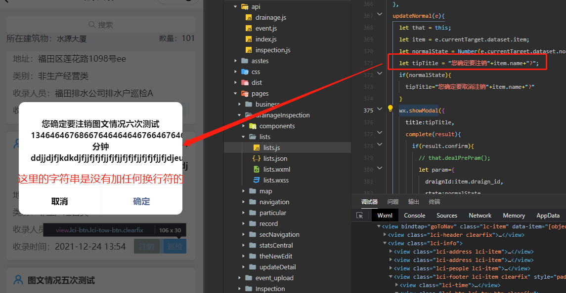 之前在view中也有这个问题,但可以通过word-break:break-all来修正(不换行),然而现在wx.showModal中样式貌似修改不了样式了。求解!!!: break-all;