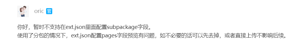去除ext.json中pages和subPackages字段是因为默认使用app.json中的配置,且ext.json不支持subPackages字段。参考帖子https://developers.weixin.qq.com/blogdetail?action=get_post_info&docid=000acc56d485c8b99446d24925b400&commentid=0006a407414a18fc4507984705bc&parent_commentid=000e6427228b308b9646ba66d568&token=650500035&lang=zh_CN