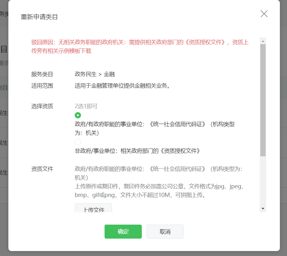 小程序版本发布审核不通过,让我添加服务类目政务民生 > 金融,去申请服务类目按照要求上传了《统一社会信用代码证》但是审核不通过,让我上传《资质授权文件》,但是我的主体是政府部门而且上传的是政府的《统一社会信用代码证》,应该不需要上传其他的证明了,怎样才能审核通过。