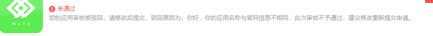 你好,“你的应用名称与官网信息不相符”——这句话就是所看到的字面意思,你申请的应用的名称,要跟该应用的官网信息相符