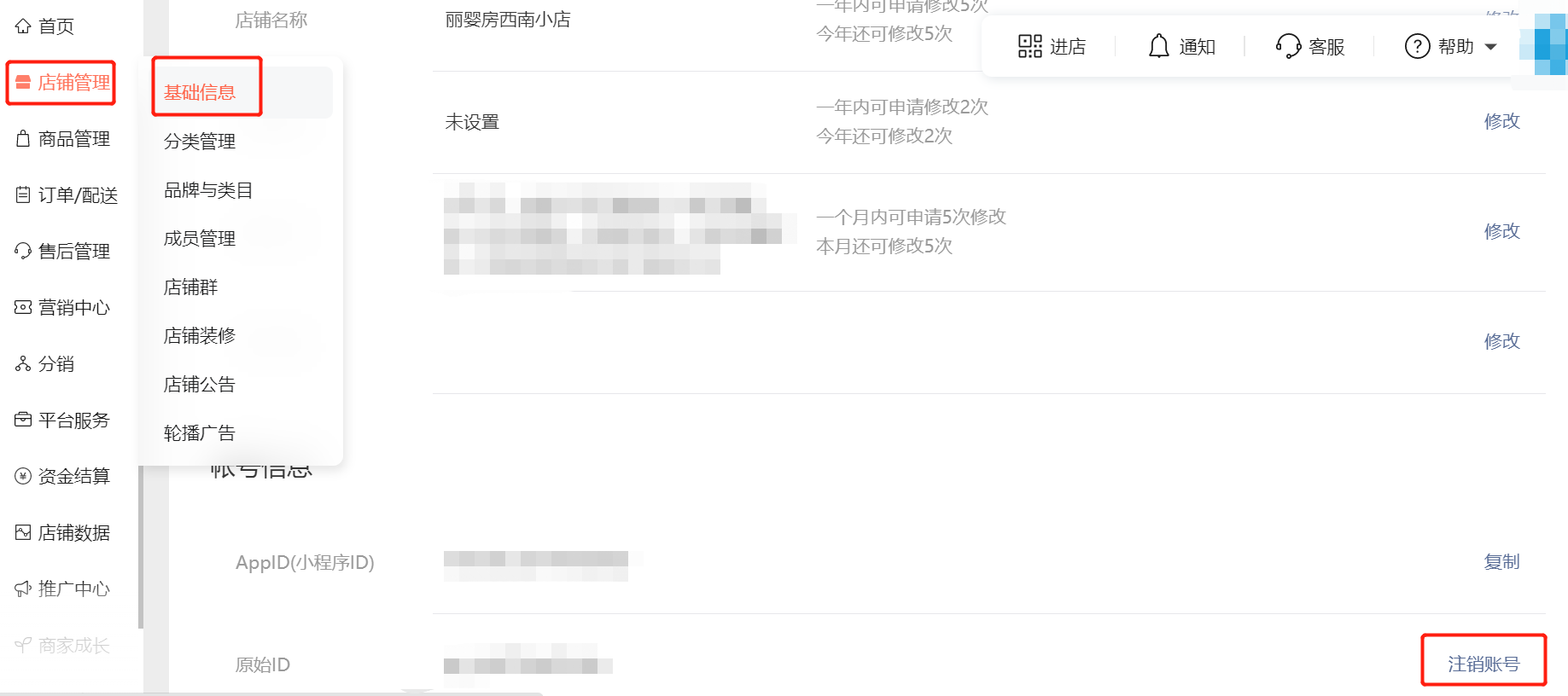 登陆电脑端浏览器网页后台https://shop.weixin.qq.com/ 店铺管理-基础信息-注销