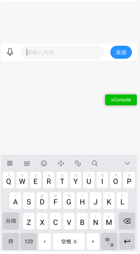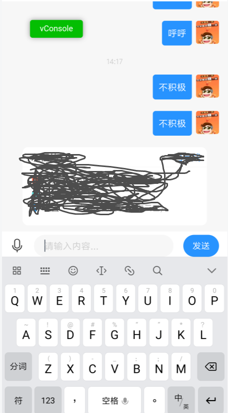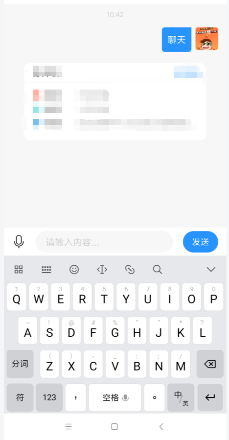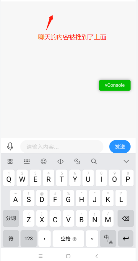 2、在聊天历史列表比较短的时候,点击键盘也会把内容会自动向上推 ,效果如下: