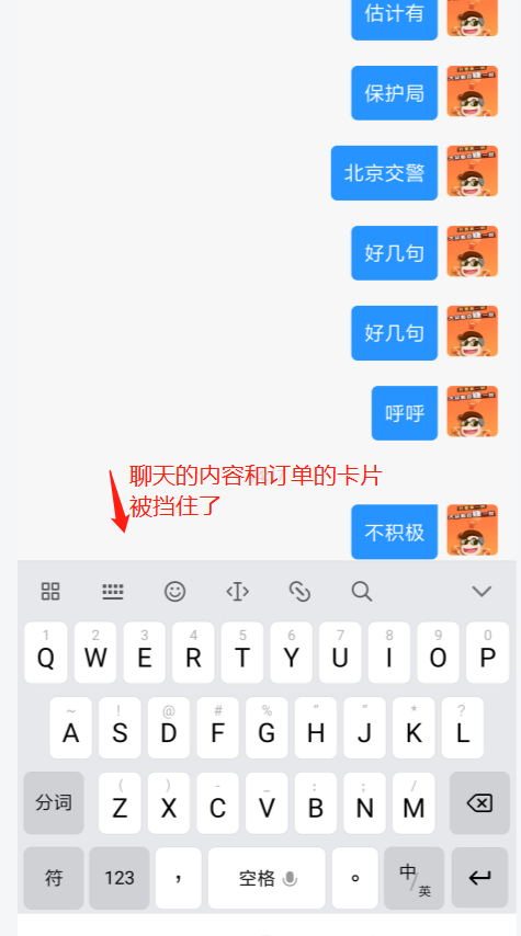 1、在聊天历史列表比较长,点击底部fixed 定位的输入框弹起手机键盘的时候,输入框上面的内容会自动向上推(涂黑部分是订单的卡片,也是聊天的历史)这个体验是可以接受的。