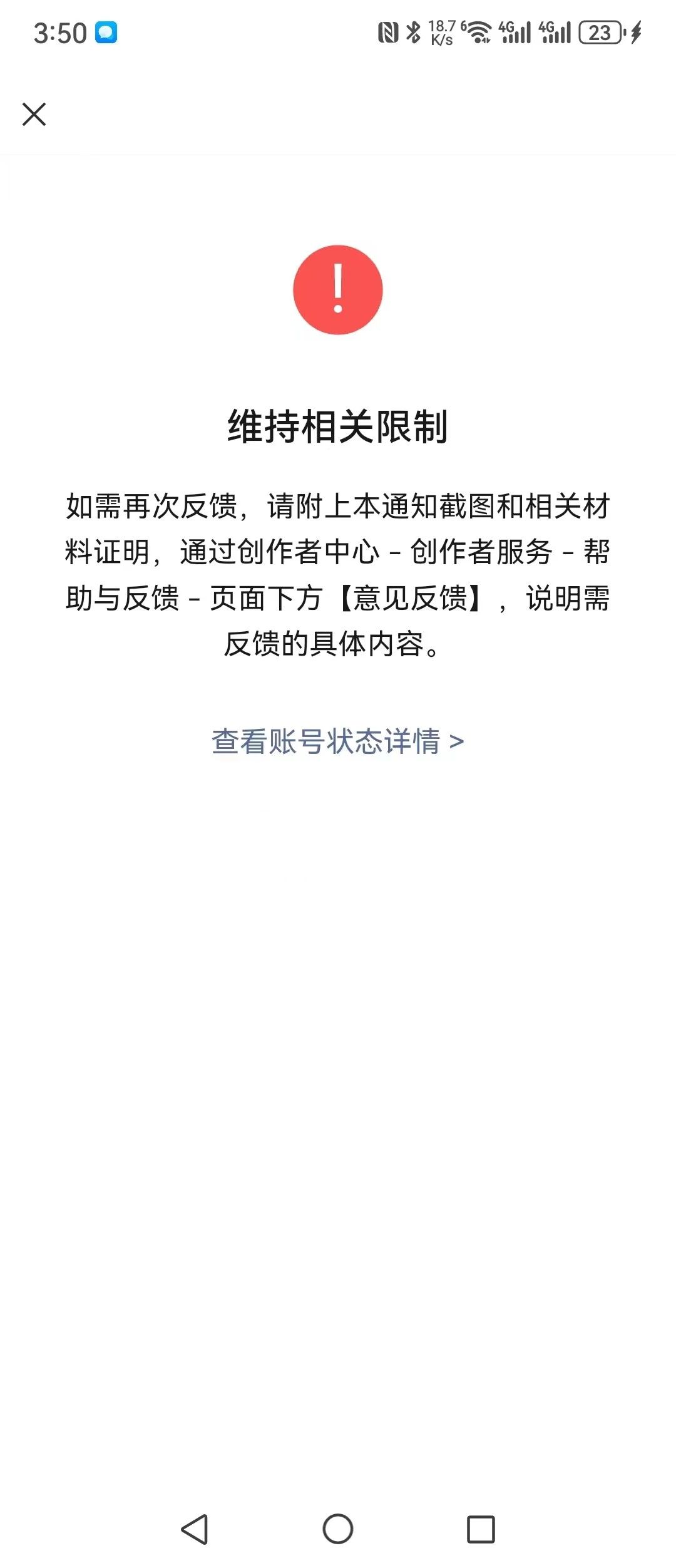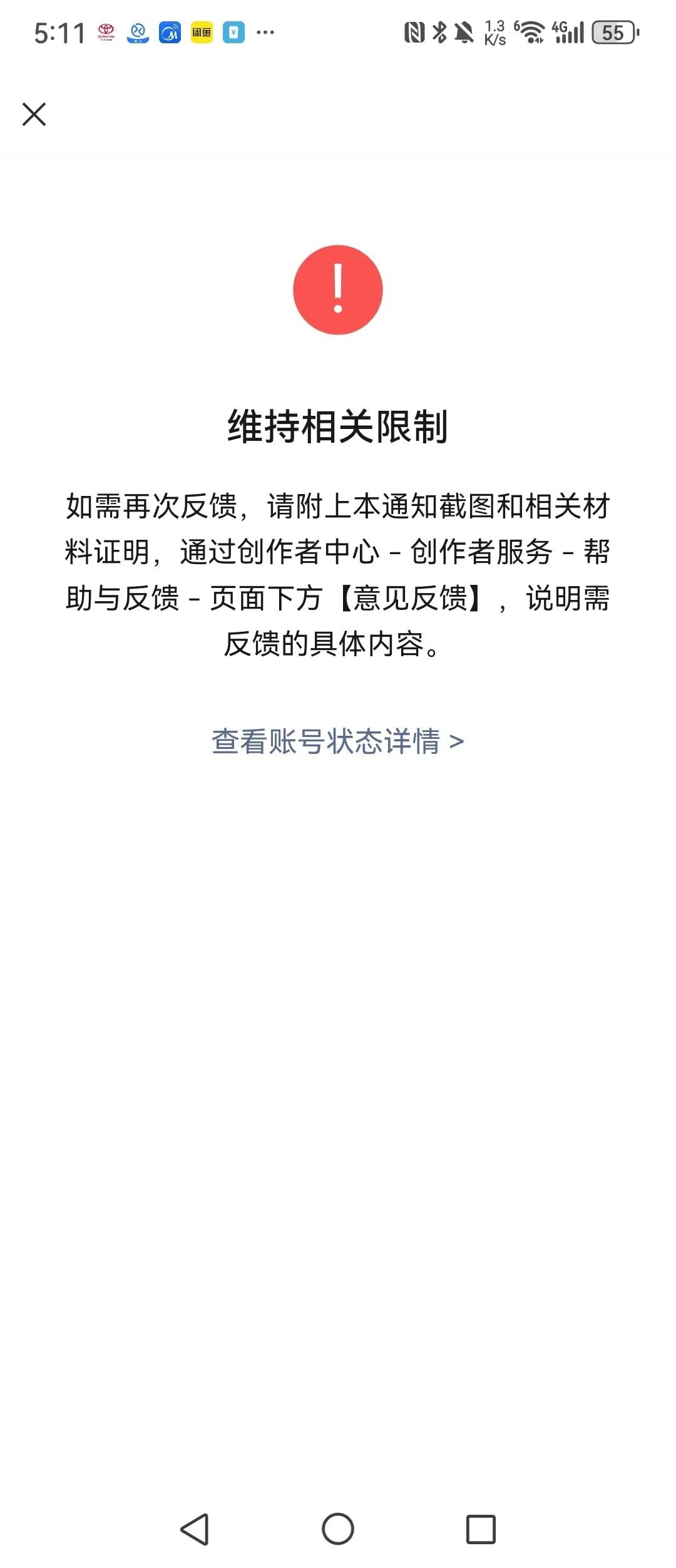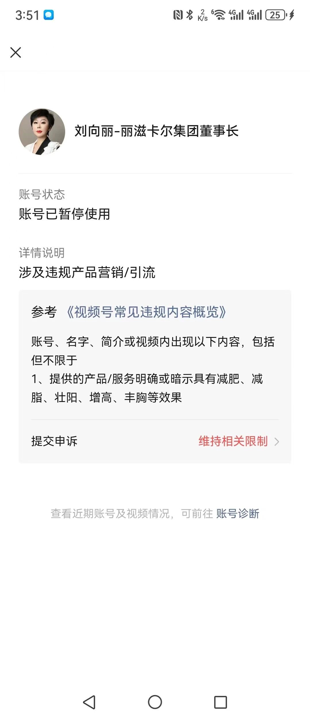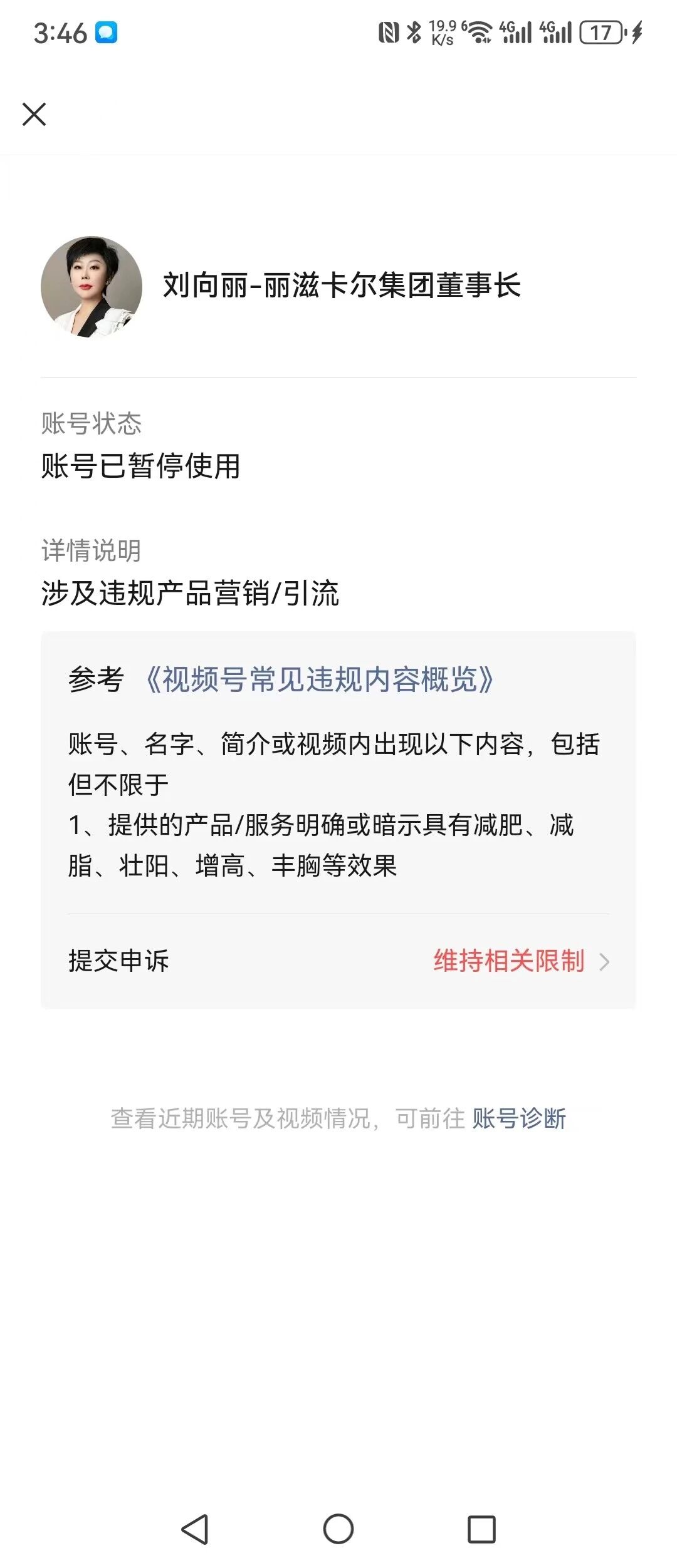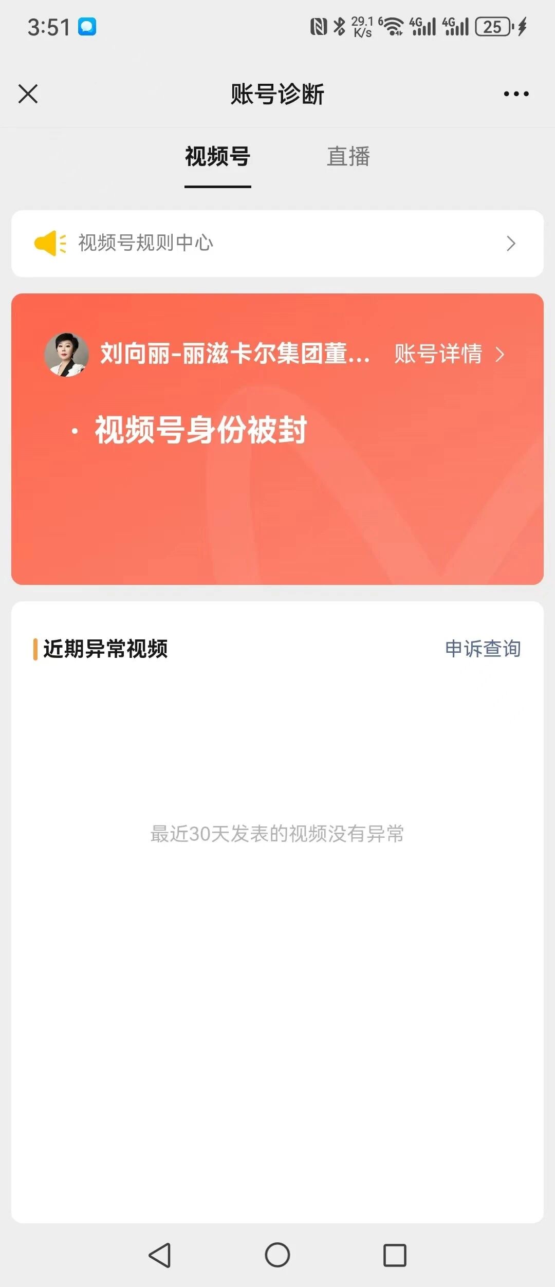 1、并没有违规提示所发的相关减肥、壮阳、增高等相关视频内容,在没有任何的警告视频号就被封而停止使用,让在创作者中心反馈 但是也没有相关入口,查询近期异常视频也没有显示 查询申诉记录也没有显示记录。