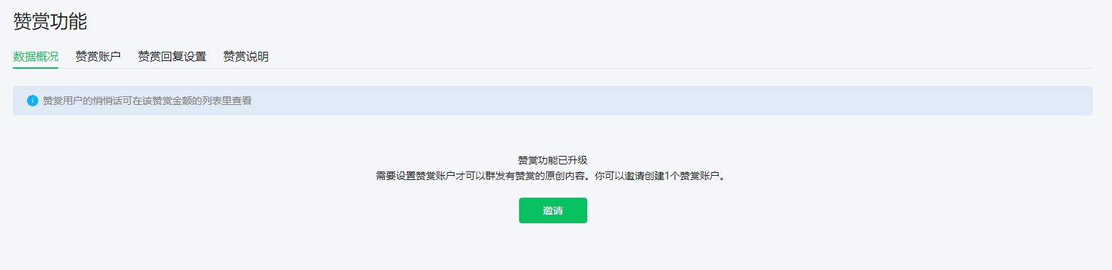 1.满足条件的公众号,可以进入“赞赏”功能,页面会有邀请按钮,点击后即可邀请个人微信号开通赞赏账户