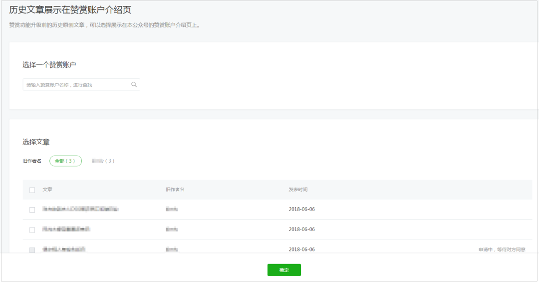 2、选择一个赞赏账户,勾选需要展示的文章,然后点击“确定”,系统会向赞赏账户对应的个人微信号发送确认通知,点开通知确认后即可。