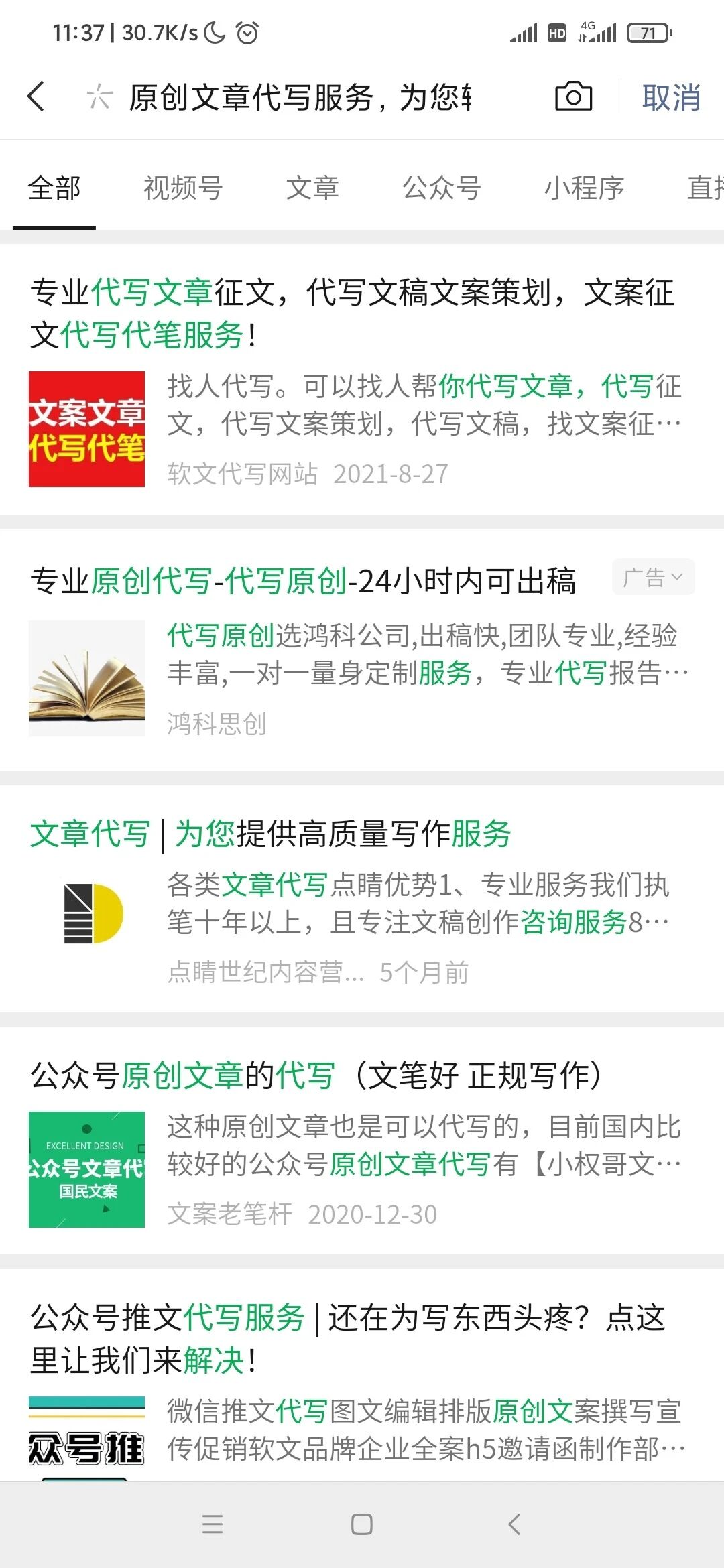 微信公众号发布的文章在搜一搜上搜不到怎么回事? 公众号名字:泡泡王的小天地 公众号微信号:gh_05e0df0d7c39 文章名称:原创文章代写服务,为您轻松解决文章烦恼!欢迎咨询! 文章链接: https://mp.weixin.qq.com/s/oaR76odXPDsWewt-Tc7C2w 该公众号上的其他文章也搜不到