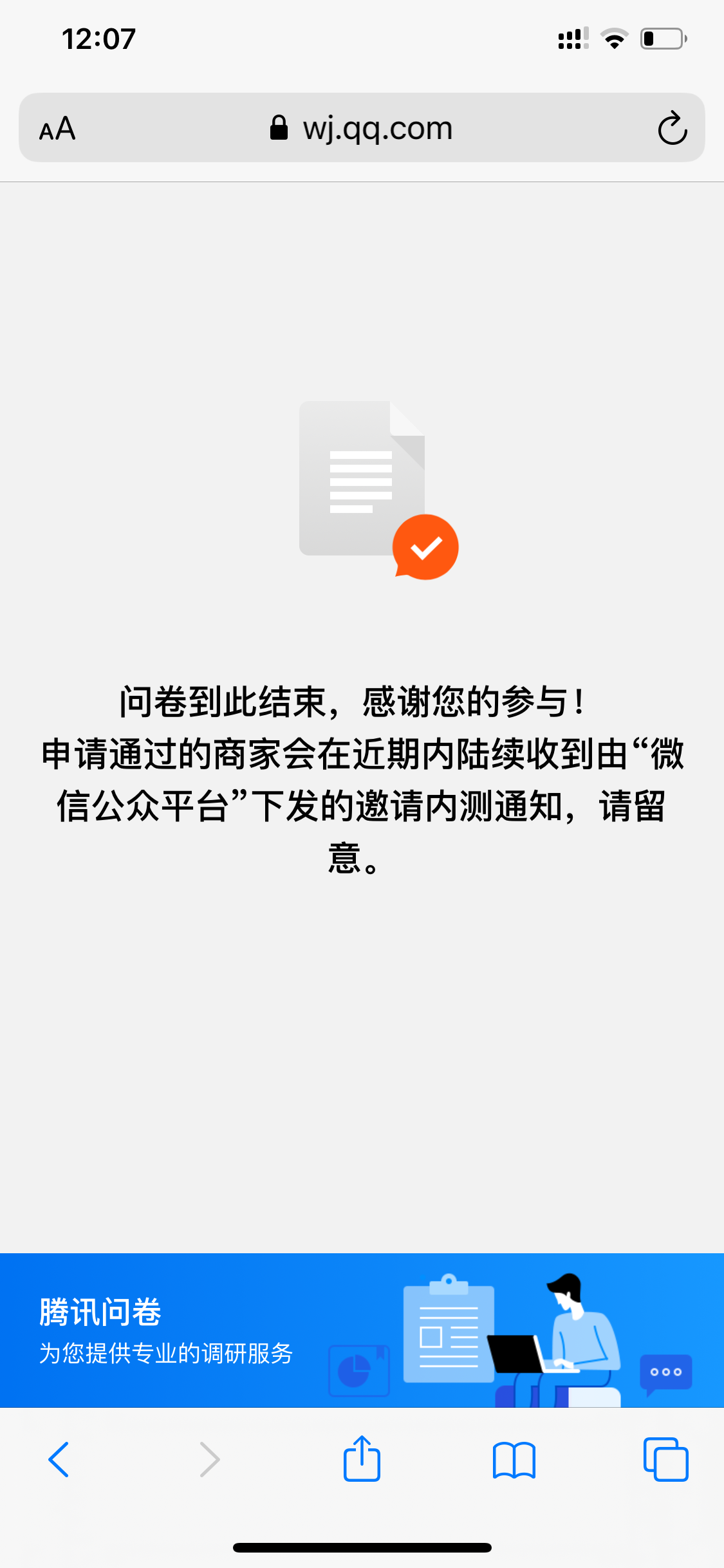 你好,内测申请通过的商家将收到微信公众平台下发的开店邀请,请注意查看;如在申请通道(https://wj.qq.com/s2/6720859/9c96/)提交申请48小时后未收到邀请,请检查填写的微信号是否正确,重新填写;如核对填写信息无误,会反馈后台查看,请耐心等待。