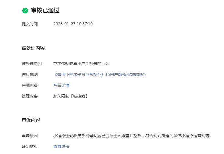 1.微信小程序账号对违规问题进行申诉且通过 2026.1.27