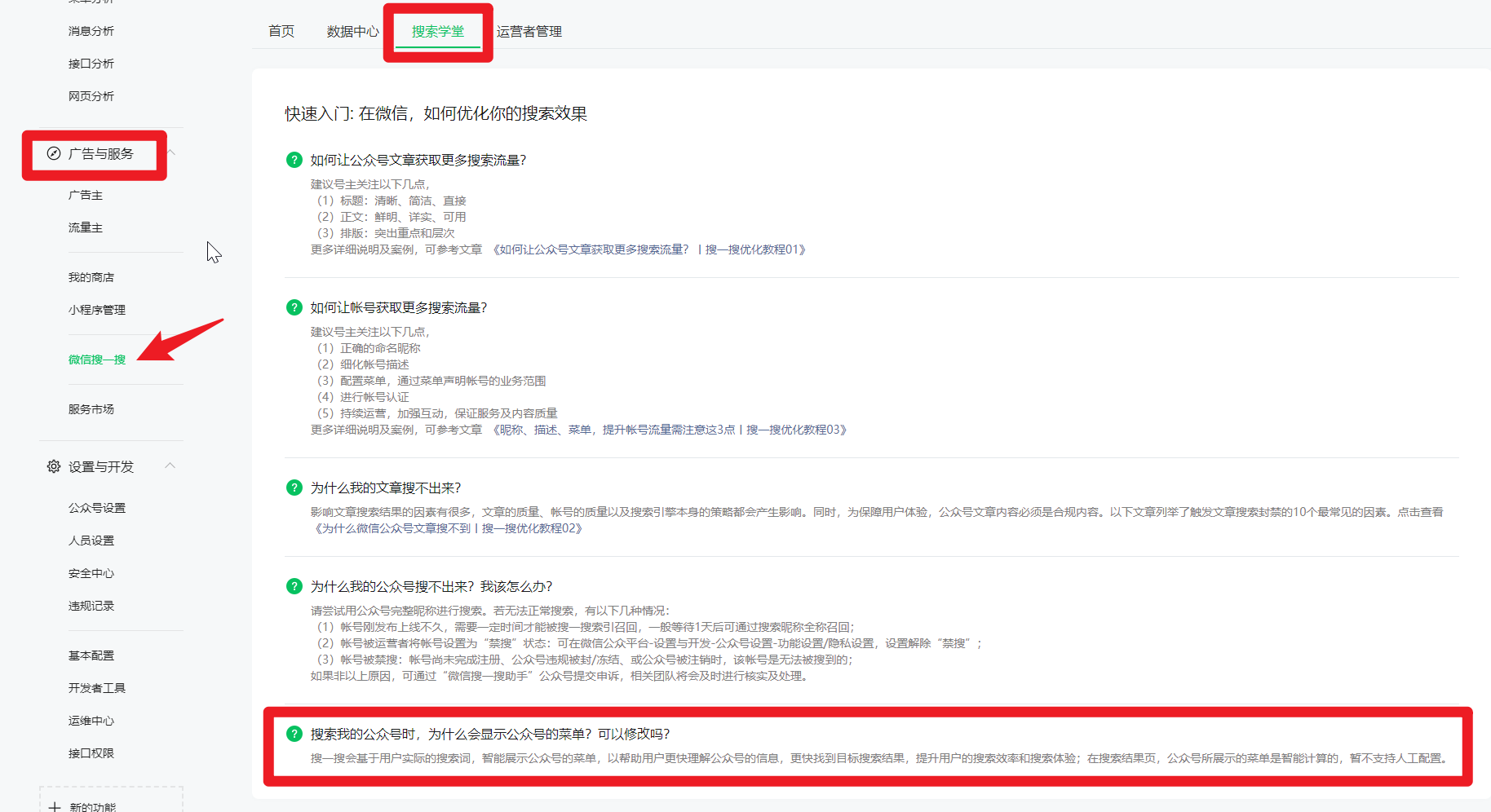 搜一搜会基于用户实际的搜索词,智能展示公众号的菜单,以帮助用户更快理解公众号的信息,更快找到目标搜索结果,提升用户的搜索效率和搜索体验;在搜索结果页,公众号所展示的菜单是智能计算的,暂不支持人工配置。