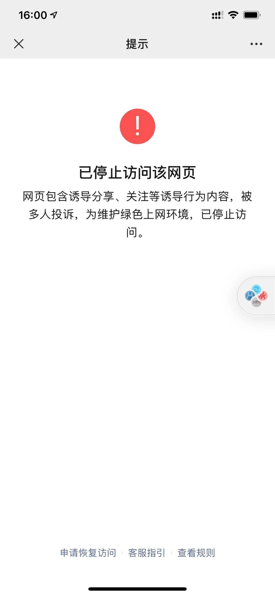 具体违规情节:违反了《微信外部链接内容管理规范》 第1.2条。