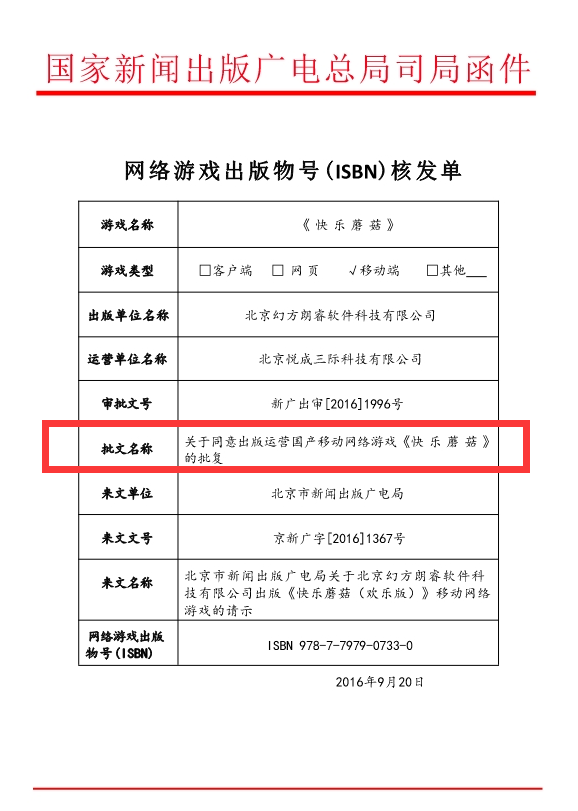 版号游戏名称《快乐蘑菇》